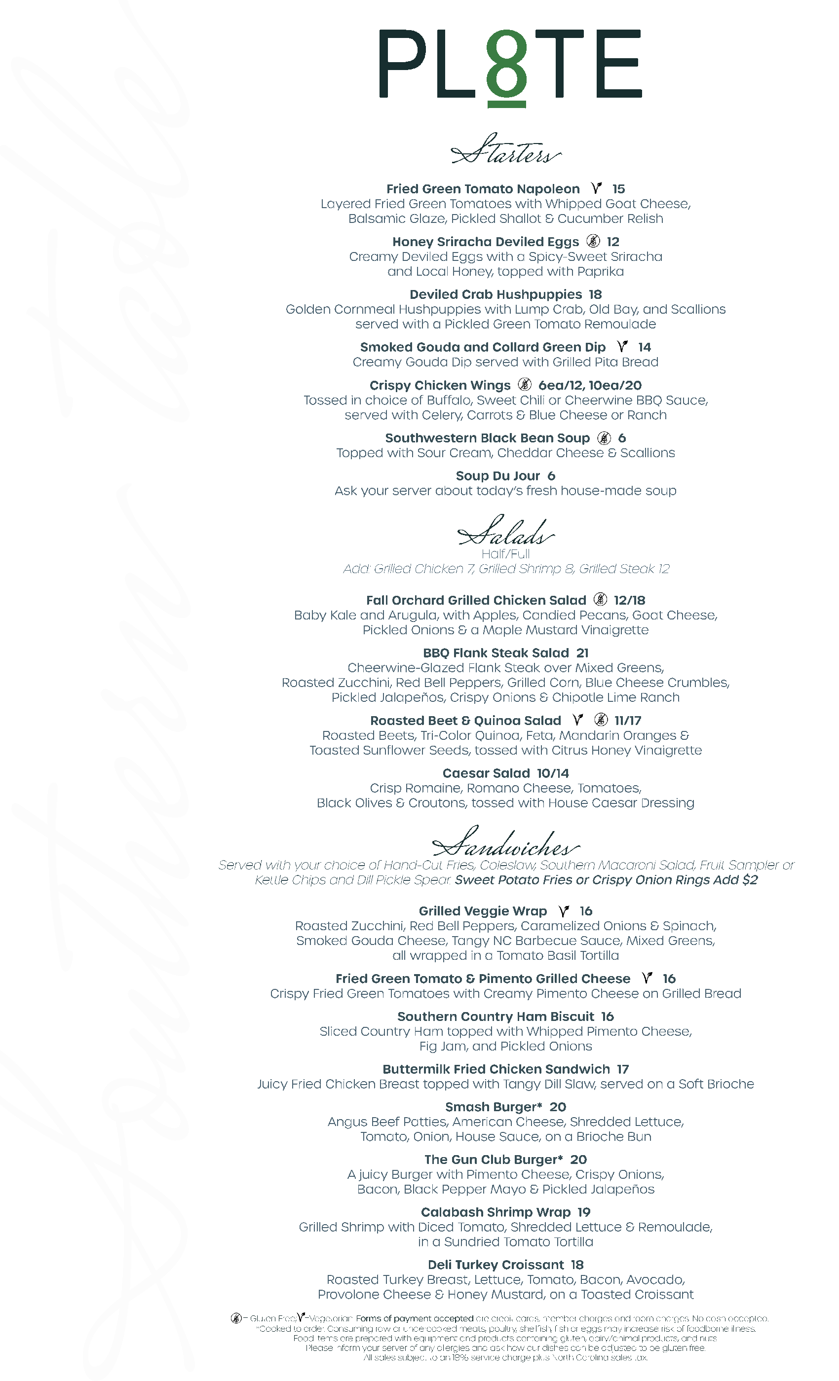 Start your day with a hearty and convenient breakfast, enjoy a fresh and creative lunch or relax over cocktails and light bites. As the sun sets, savor an artfully prepared dinner — from buttermilk pan-fried chicken with Carolina Gold sauce to cornmeal-crusted trout or steak Oscar with lump crab and béarnaise. With signature cocktails, local craft brews, and decadent desserts like sweet potato bread pudding or pecan pie cheesecake, PL8TE is more than a restaurant — it’s a flavorful highlight of your Pinehurst experience, and our newest must-try destination for bold flavors and Southern comfort.