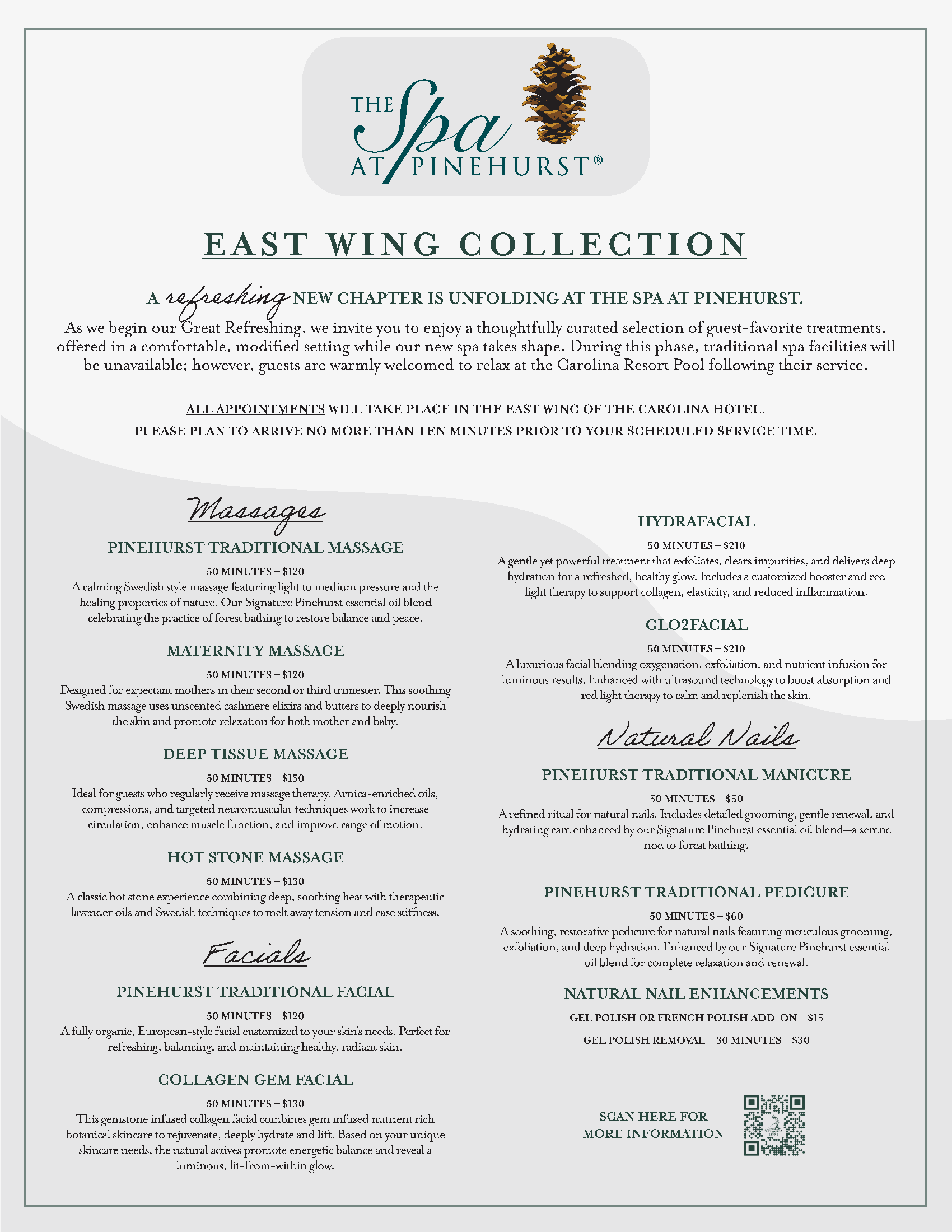 The Spa at Pinehurst is undergoing renovations to create a refreshed and tranquil new experience for guests. As part of this transformation, the spa will be closed from June 15, 2026 through October 2026.